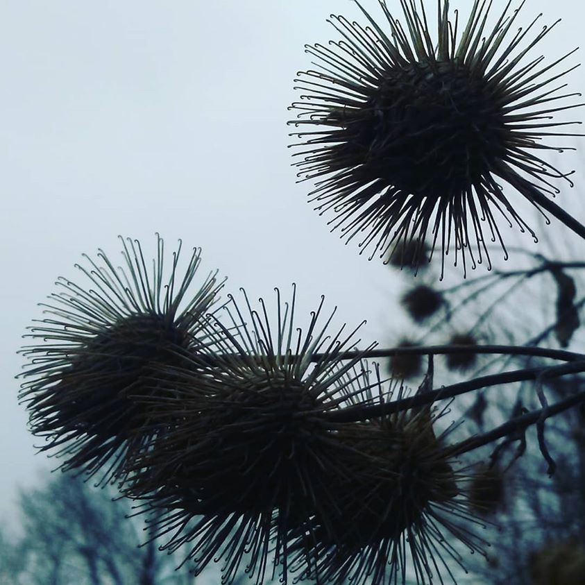 “Hard not to love these feisty burdocks even if there are a dozen in Fiona’s fur right now. Soon their huge wooly heart-shaped leaves will return and also the ghost moths, whose larvae feed on their roots.”